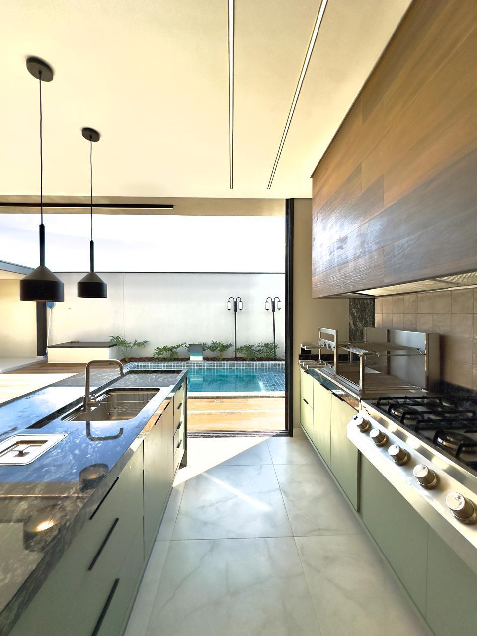 Cozinha com: churrasqueira, rangertop, micro-ondas e forno embutidos.